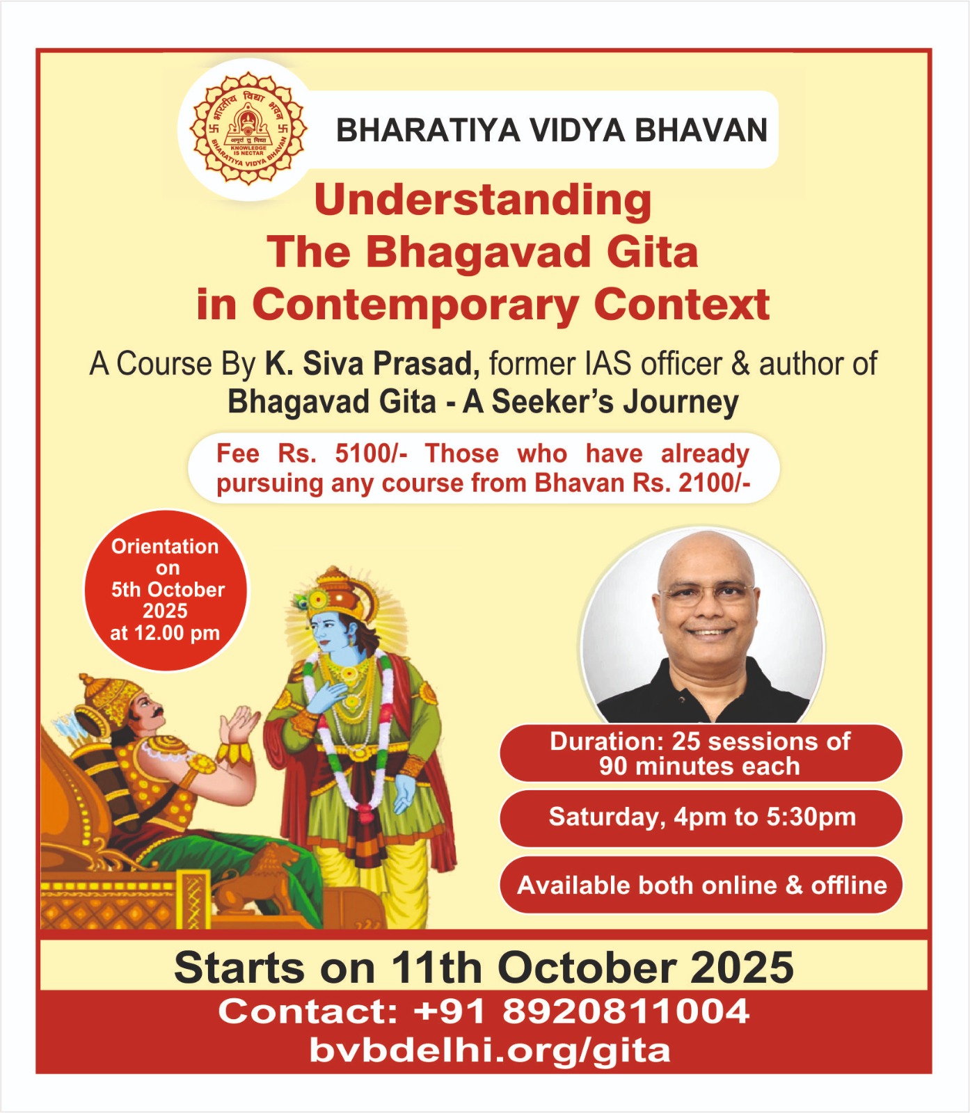 - The course starts on 13th September, 2025 (Saturday) A. The session would be on every Saturday between 4.00 pm – 6.00 pm. at Bharatiya Vidya Bhavan, Kasturba Gandhi Marg, New Delhi.